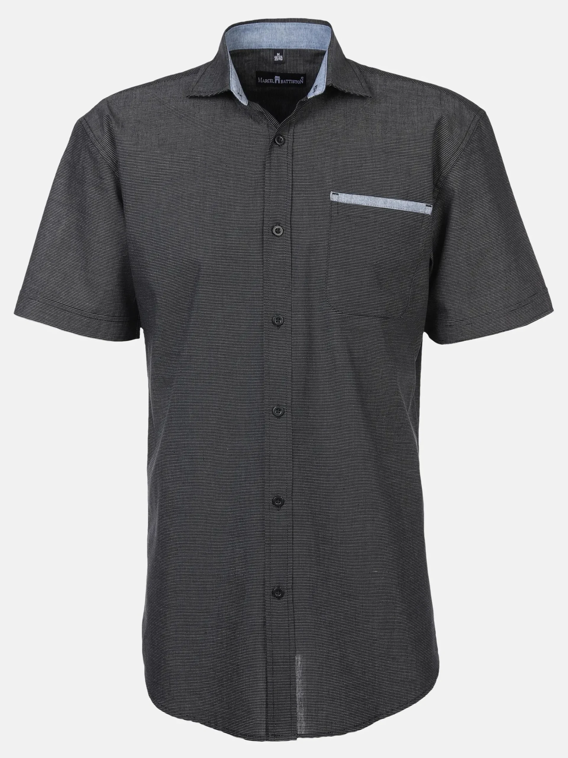 - klassischer Kentkragen und aufgesetzte Brusttasche mit abgesetzter Paspelumrandung